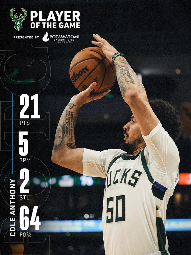 雄鹿新援科尔·安东尼本场表现出色,出场19分钟,11投7中,其中外线6中5,得到全队最高的21分,还有2篮板2助攻2抢断,他的外线火力有望成为新赛季字母哥的好帮手。